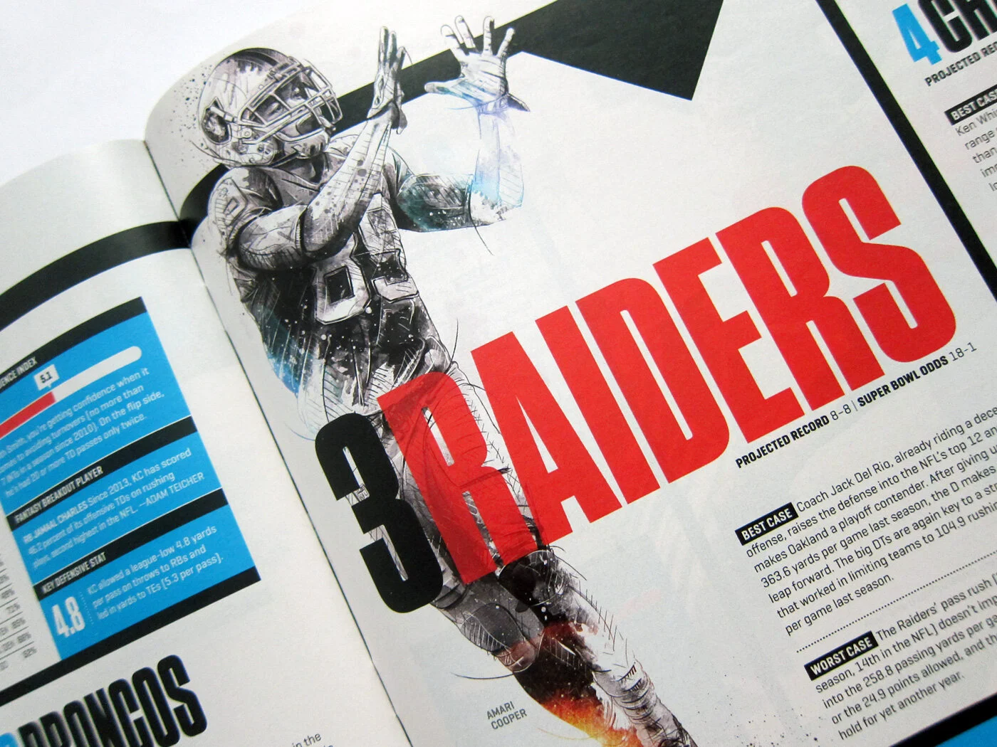 The illustrations were used in layout: as full-page visuals and cut-out figures integrated directly into editorial rankings and team previews.